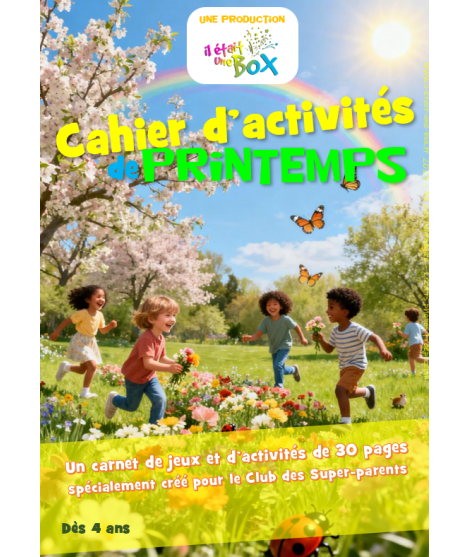 Carnet d'activités en PDF à recevoir par email de 30 pages (deux tranches d'âge 5/7 ans et + de 8 ans) de jeux, de coloriages et d'activités sur le thème du Printemps.